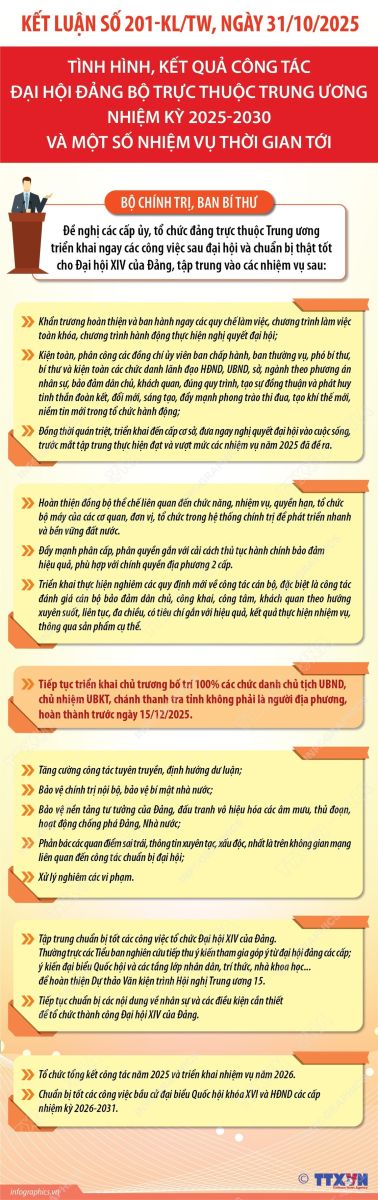 Tại Kết luận số 201-KL/TW ngày 31/10/2025 về tình hình, kết quả công tác đại hội đảng bộ trực thuộc Trung ương nhiệm kỳ 2025-2030 và một số nhiệm vụ thời gian tới, Bộ Chính trị, Ban Bí thư Đề nghị các cấp uỷ, tổ chức đảng trực thuộc Trung ương triển khai ngay các công việc sau đại hội và chuẩn bị thật tốt cho Đại hội XIV của Đảng, tập trung vào các nhiệm vụ: Khẩn trương hoàn thiện và ban hành ngay các quy chế làm việc, chương trình làm việc toàn khoá, chương trình hành động thực hiện nghị quyết đại hội; kiện toàn, phân công các đồng chí uỷ viên ban chấp hành, ban thường vụ, phó bí thư, bí thư và kiện toàn các chức danh lãnh đạo hội đồng nhân dân, uỷ ban nhân dân, sở, ngành theo phương án nhân sự, bảo đảm dân chủ, khách quan, đúng quy trình, tạo sự đồng thuận và phát huy tinh thần đoàn kết, đổi mới, sáng tạo, đẩy mạnh phong trào thi đua, tạo khí thế mới, niềm tin mới trong tổ chức hành động; đồng thời quán triệt, triển khai đến cấp cơ sở, đưa ngay nghị quyết đại hội vào cuộc sống, trước mắt tập trung thực hiện đạt và vượt mức các nhiệm vụ năm 2025 đã đề ra. Hoàn thiện đồng bộ thể chế liên quan đến chức năng, nhiệm vụ, quyền hạn, tổ chức bộ máy của các cơ quan, đơn vị, tổ chức trong hệ thống chính trị để phát triển nhanh và bền vững đất nước. Đẩy mạnh phân cấp, phân quyền gắn với cải cách thủ tục hành chính bảo đảm hiệu quả, phù hợp với chính quyền địa phương 2 cấp. Triển khai thực hiện nghiêm các quy định mới về công tác cán bộ, đặc biệt là công tác đánh giá cán bộ bảo đảm dân chủ, công khai, công tâm, khách quan theo hướng xuyên suốt, liên tục, đa chiều, có tiêu chí gắn với hiệu quả, kết quả thực hiện nhiệm vụ, thông qua sản phẩm cụ thể. Tiếp tục triển khai chủ trương bố trí 100% các chức danh chủ tịch uỷ ban nhân dân, chủ nhiệm uỷ ban kiểm tra, chánh thanh tra tỉnh không phải là người địa phương, hoàn thành trước ngày 15/12/2025
