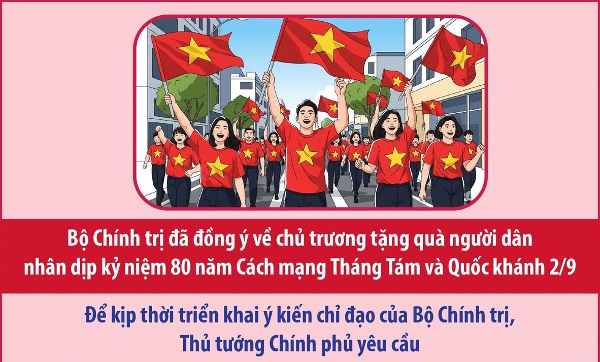 Trong không khí cả nước tưng bừng phấn khởi chào mừng kỷ niệm 80 năm Cách mạng Tháng Tám và Quốc khánh 2/9, để tiếp tục thể hiện sự quan tâm sâu sắc của Đảng và Nhà nước đối với toàn thể nhân dân, triển khai ý kiến chỉ đạo của đồng chí Tổng Bí thư Tô Lâm, Đảng ủy Chính phủ đã trình Bộ Chính trị về việc tổ chức tặng quà cho người dân nhân dịp kỷ niệm 80 năm Cách mạng Tháng Tám và Quốc khánh 2/9. Tại văn bản số 17129-CV/VPTW ngày 28/8/2025 của Văn phòng Trung ương, Bộ Chính trị đã đồng ý về chủ trương tặng quà người dân nhân dịp kỷ niệm 80 năm Cách mạng Tháng Tám và Quốc khánh 2/9.