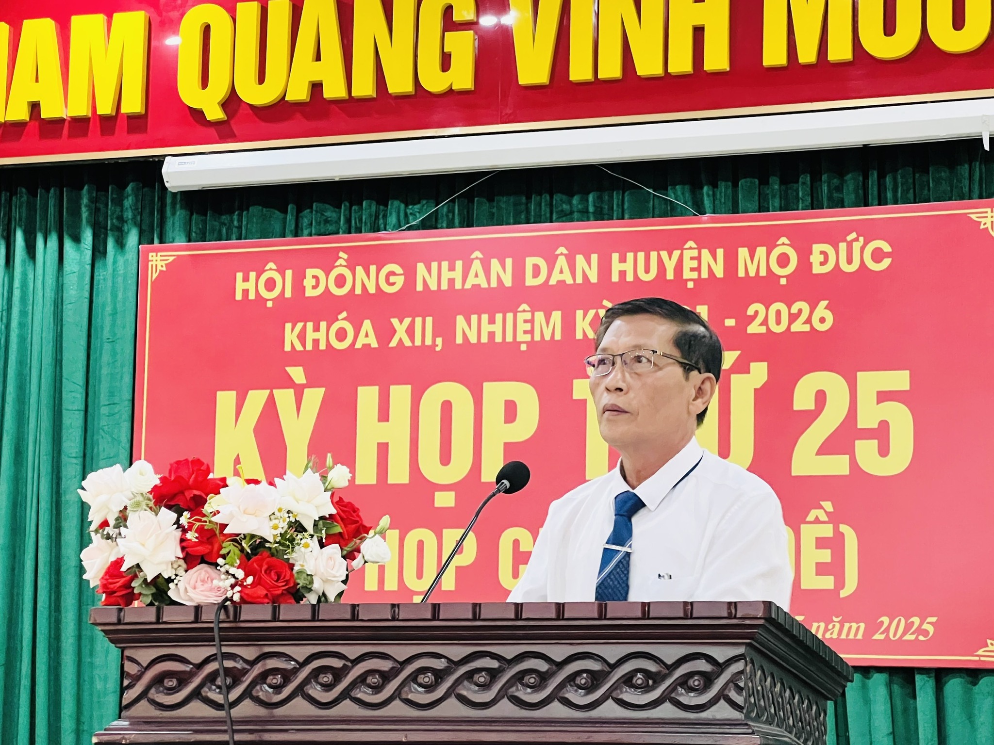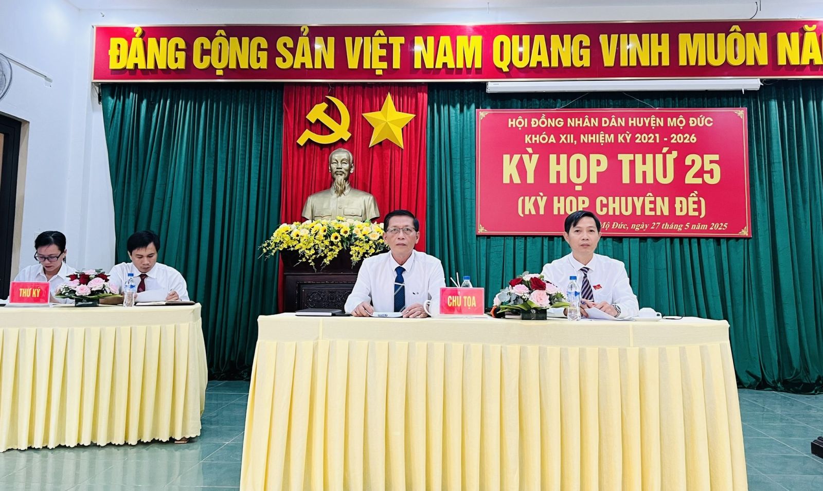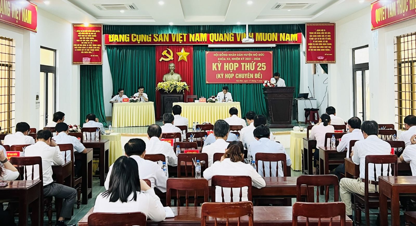 Sáng ngày 27/5/2025, Hội đồng nhân dân huyện Mộ Đức tổ chức kỳ họp thứ 25 khóa XII (kỳ họp chuyên đề) nhiệm kỳ 2021-2026. Đồng chí Nguyễn Quang Vinh, Phó Bí thư thường trực, Chủ tịch HĐND huyện và đồng chí Trần Ngọc Nam - HUV, Phó Chủ tịch HĐND huyện tham dự và đồng chủ trì kỳ họp. Dự kỳ họp có đồng chí Phạm Ngọc Lân - Phó Bí thư, Chủ tịch UBND huyện; Lê Thái Huyên - UVBTV, Chủ tịch Ủy ban MTTQVN huyện; Võ Lâm - UVBTV, Phó Chủ tịch UBND huyện; Ngô Văn Thanh - HUV, Phó Chủ tịch UBND huyện.