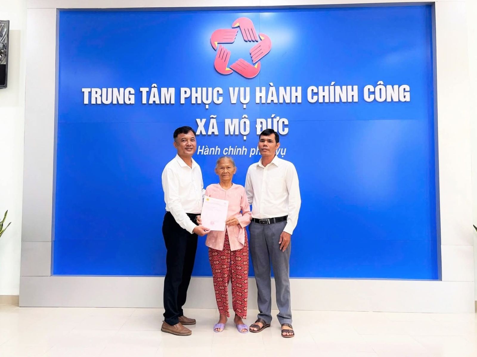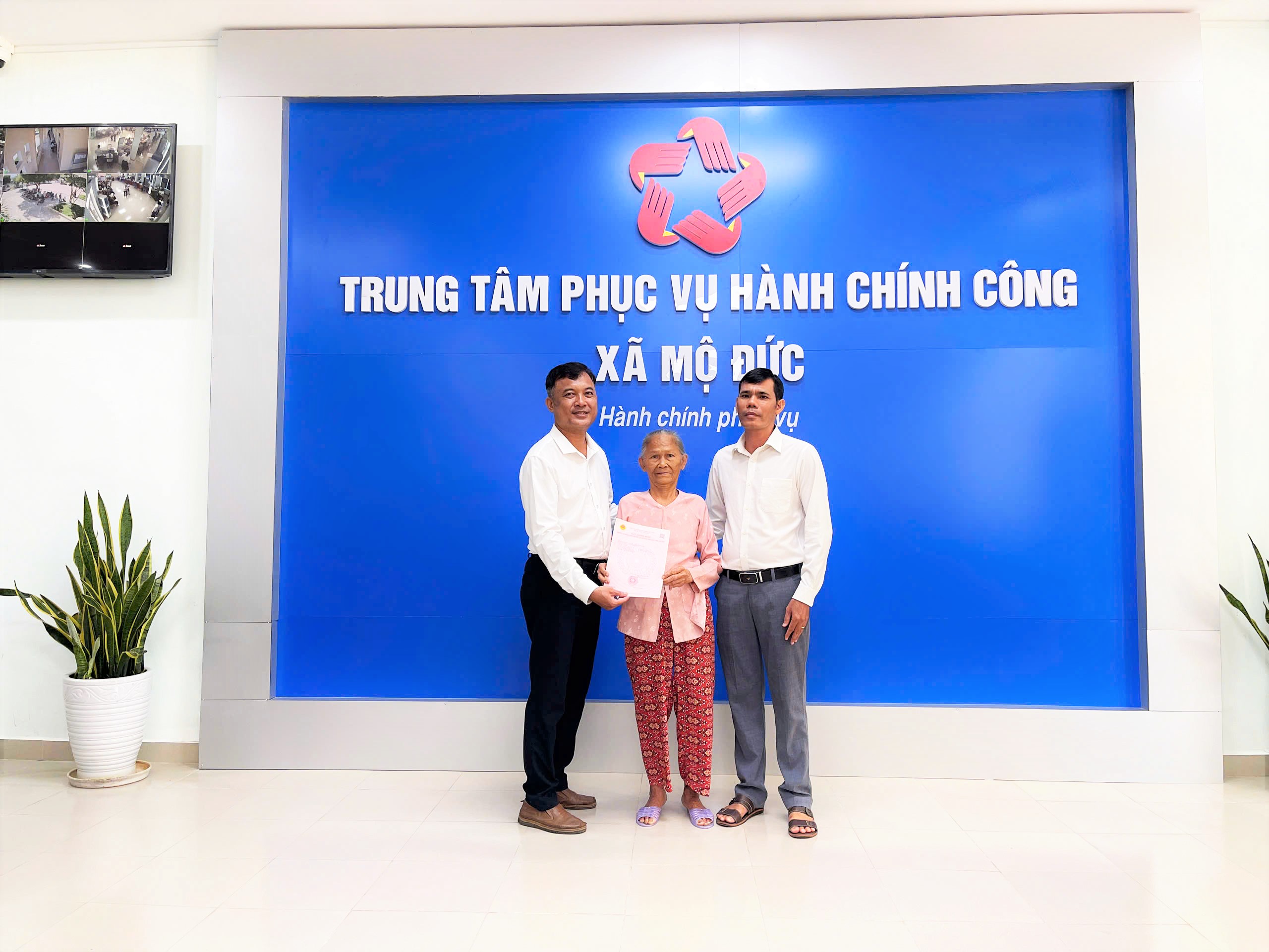 Sáng ngày 11/8/2025, Trung tâm Phục vụ hành chính công xã Mộ Đức đã tổ chức trao Giấy chứng nhận quyền sử dụng đất cho các công dân đầu tiên trên địa bàn xã, kể từ khi đi vào vận hành chính quyền xã mới từ ngày 01/7/2025.