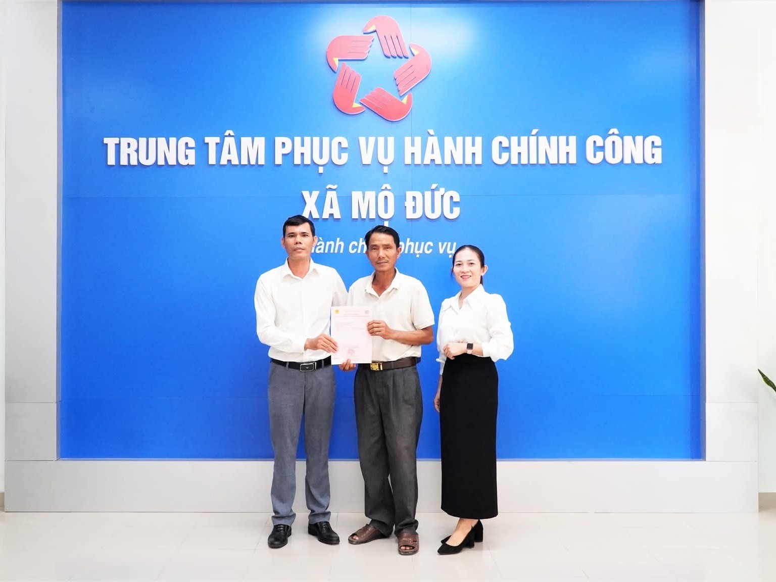 Xã Mộ Đức trao kết quả giải quyết thủ tục cấp giấy chứng nhận quyền sử dụng đất cho những công dân đầu tiên của sau khi vận hành chính quyền xã mới