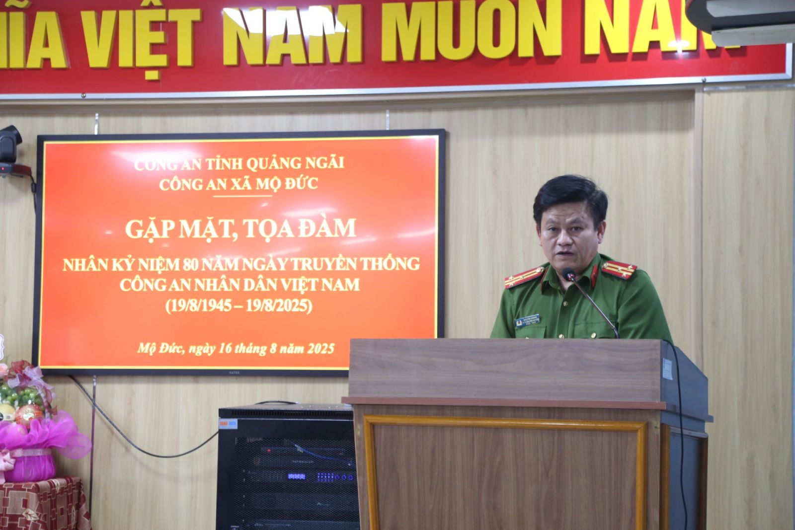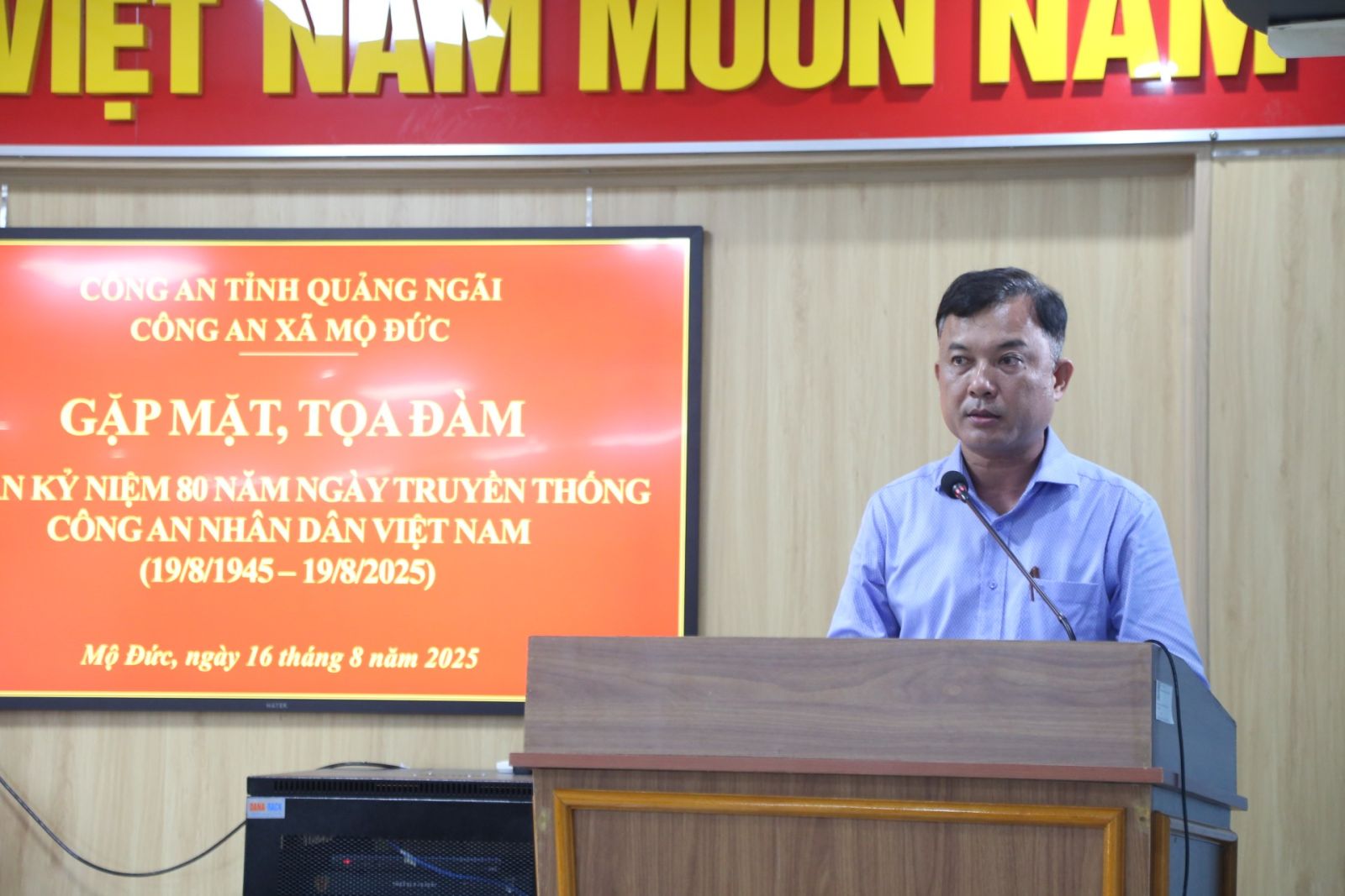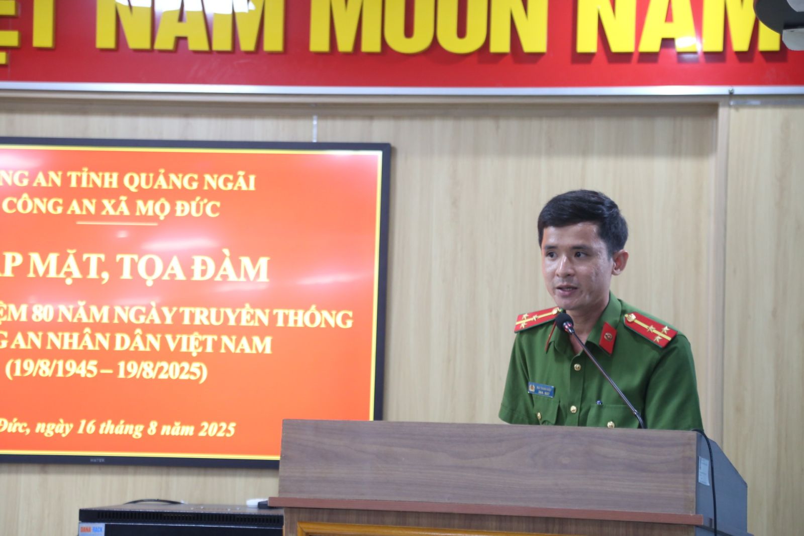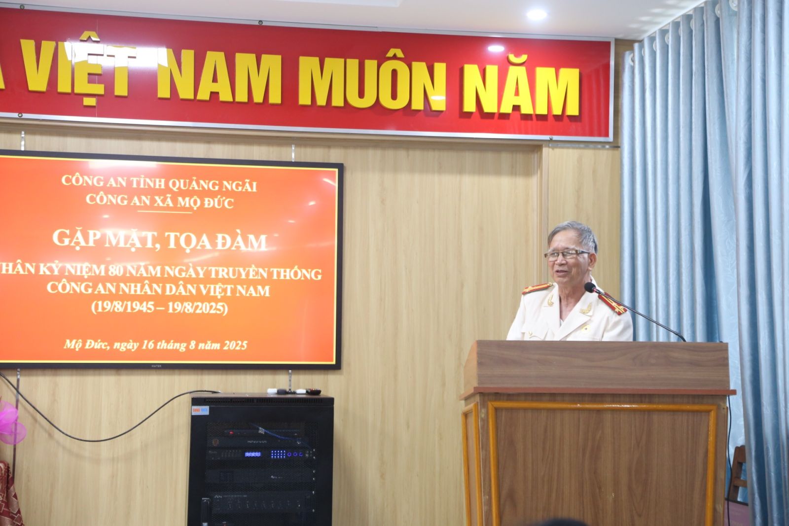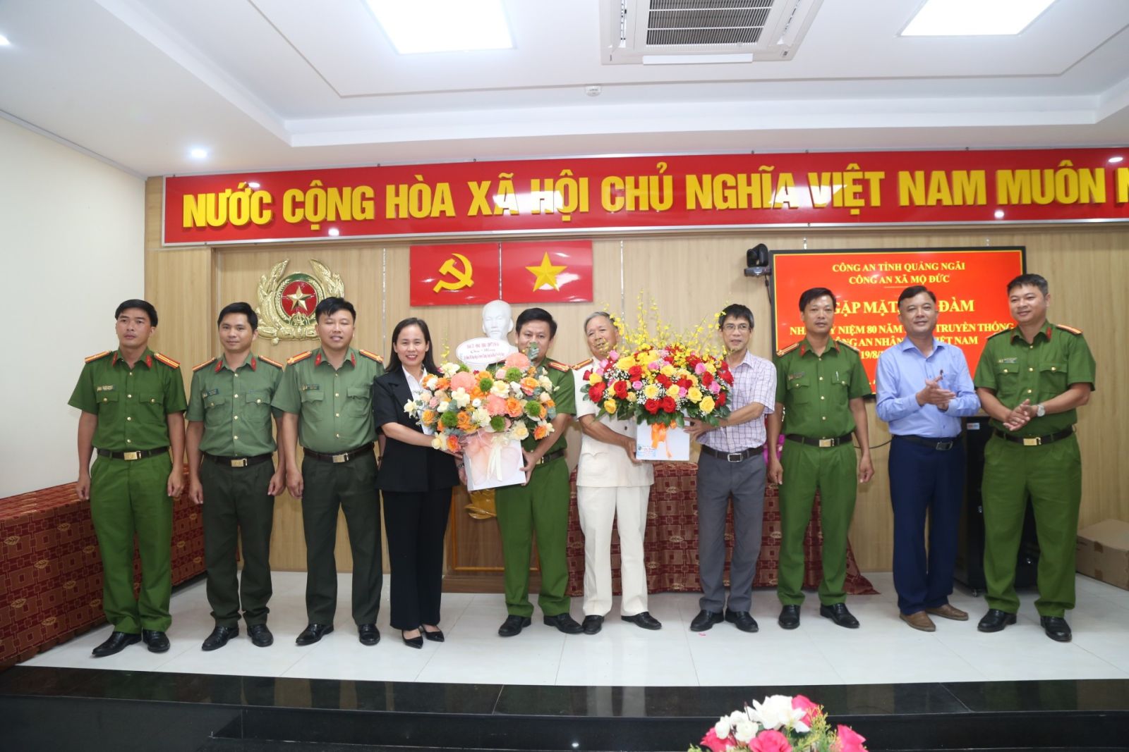 Chiều ngày 16/8/2025, tại Hội trường Công an xã Mộ Đức, Công an xã Mộ Đức long trọng tổ chức buổi gặp mặt kỷ niệm 80 năm Ngày truyền thống Công an nhân dân Việt Nam (19/8/1945 - 19/8/2025) Tham dự buổi gặp mặt có đồng chí Phạm Thị Lệ Nguyên - Bí thư Đảng ủy, Chủ tịch HĐND xã; đồng chí Bùi Quang Lập - Phó Bí thư Thường trực Đảng ủy xã; đồng chí Nguyễn Xuân Thái - Phó Bí thư, Chủ tịch UBND xã; tập thể cán bộ chiến sĩ Công an xã; các đồng chí là cựu Công an nhân dân trên địa bàn xã.