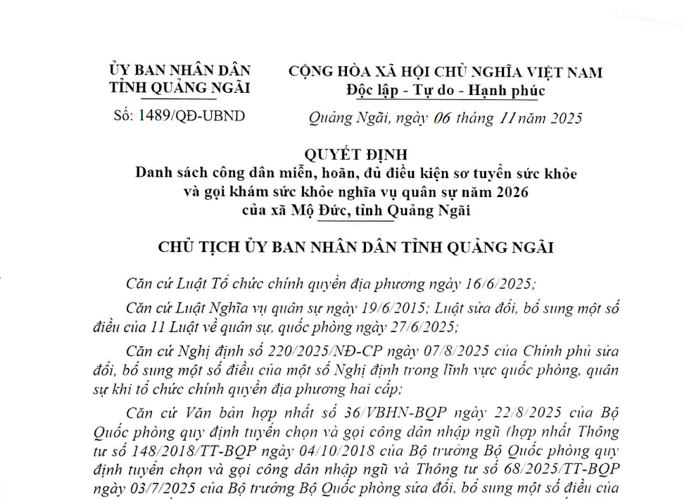 Ngày 30/10/2025, Chủ tịch UBND tỉnh Quảng Ngãi Nguyễn Hoàng Giang đã ký ban hành Quyết định về danh sách công dân miễn, hoãn, đủ điều kiện sơ tuyển sức khỏe và gọi khám sức khỏe nghĩa vụ quân sự năm 2026 của xã Mộ Đức, tỉnh Quảng Ngãi.