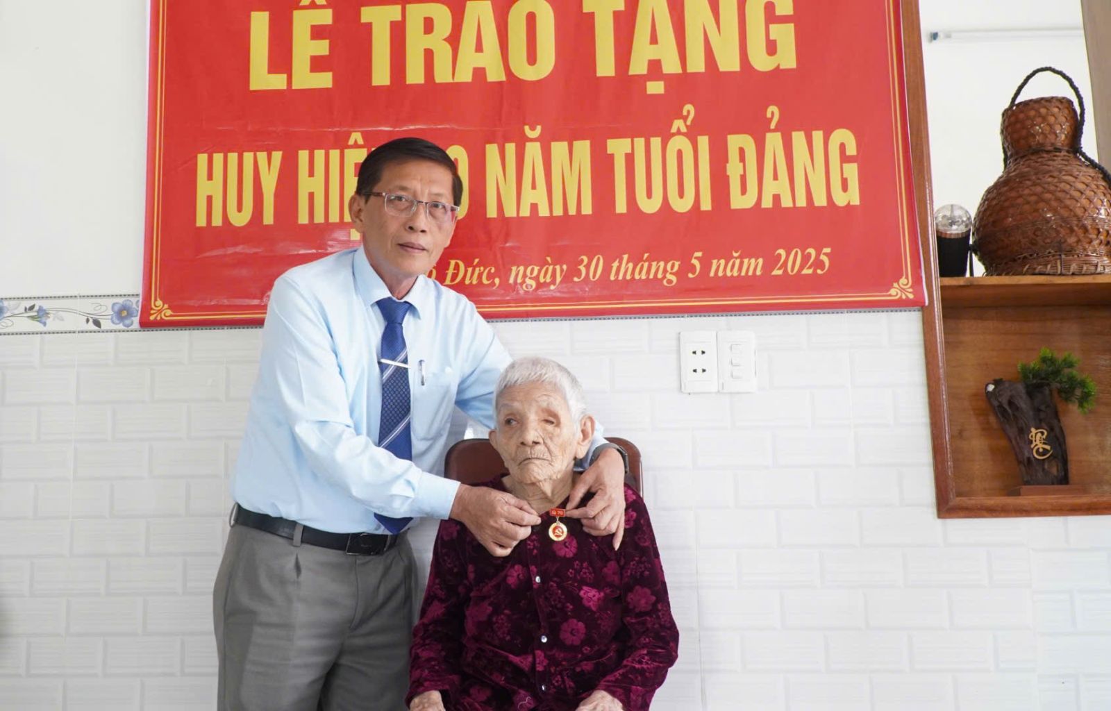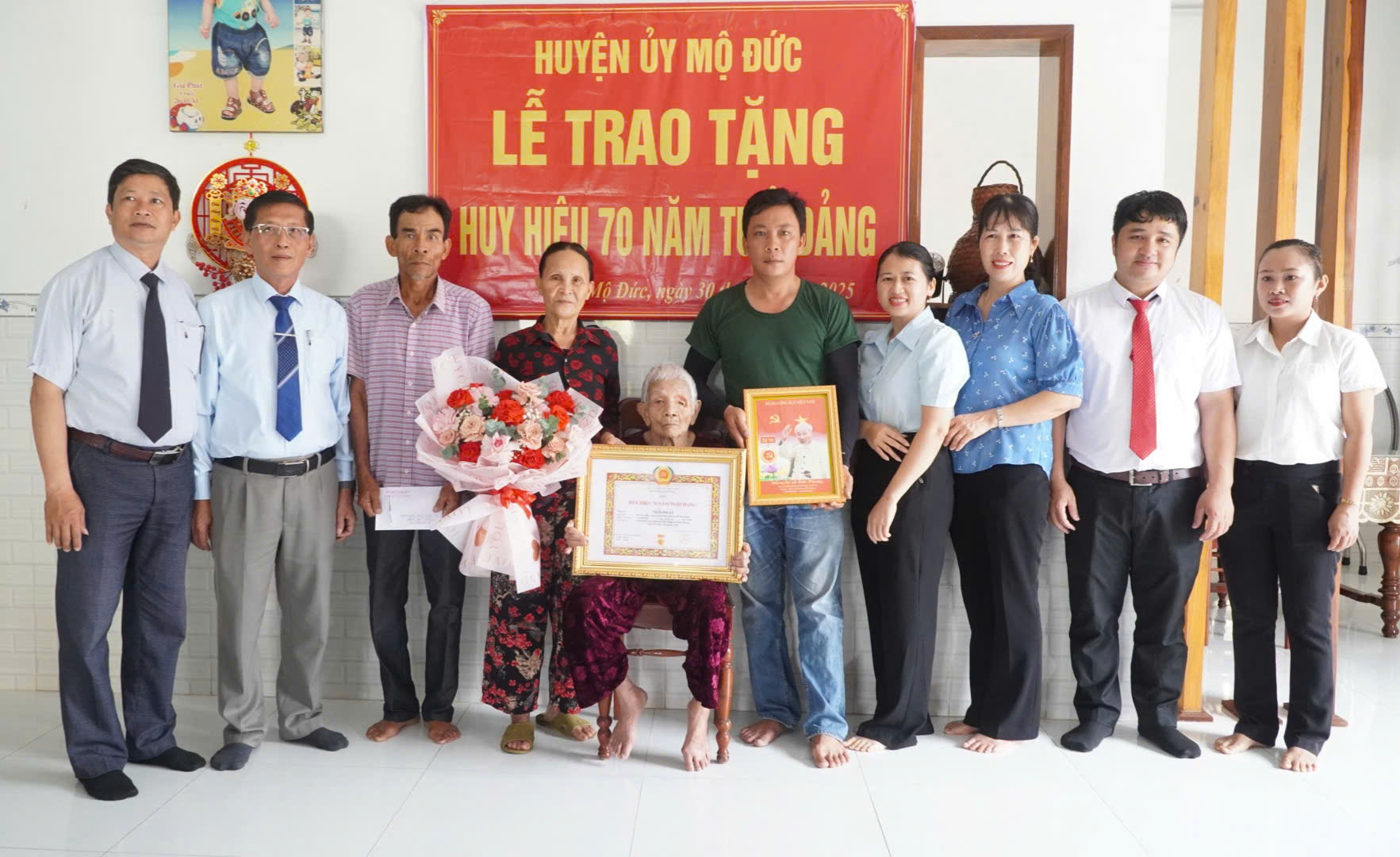 Sáng ngày 30/5, Huyện ủy Mộ Đức tổ chức lễ trao tặng Huy hiệu 70 năm tuổi Đảng cho cụ bà Ngô Thị Vê là đảng viên thuộc chi bộ thôn Lâm Thượng xã Đức Phong. Dự buổi lễ có đồng chí Nguyễn Quang Vinh - Phó Bí thư Huyện ủy, Chủ tịch HĐND huyện; cùng các đồng chí Ủy viên Ban thường vụ Huyện ủy; tham dự lễ còn có các đồng chí Phó Bí thư Đảng ủy xã Đức Phong, Bí thư chi bộ thôn Lâm Thượng.