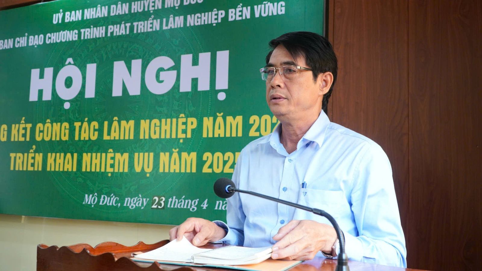 Chiều 23/4, UBND huyện Mộ Đức tổ chức Hội nghị tổng kết công tác lâm nghiệp năm 2024 và triển khai nhiệm vụ trọng tâm năm 2025. Đồng chí Ngô Văn Thanh - Phó Chủ tịch UBND huyện dự và chủ trì hội nghị. Tham dự hội nghị còn có đồng chí Phạm Duy Hưng - Chi cục trưởng Chi cục Kiểm lâm tỉnh Quảng Ngãi.