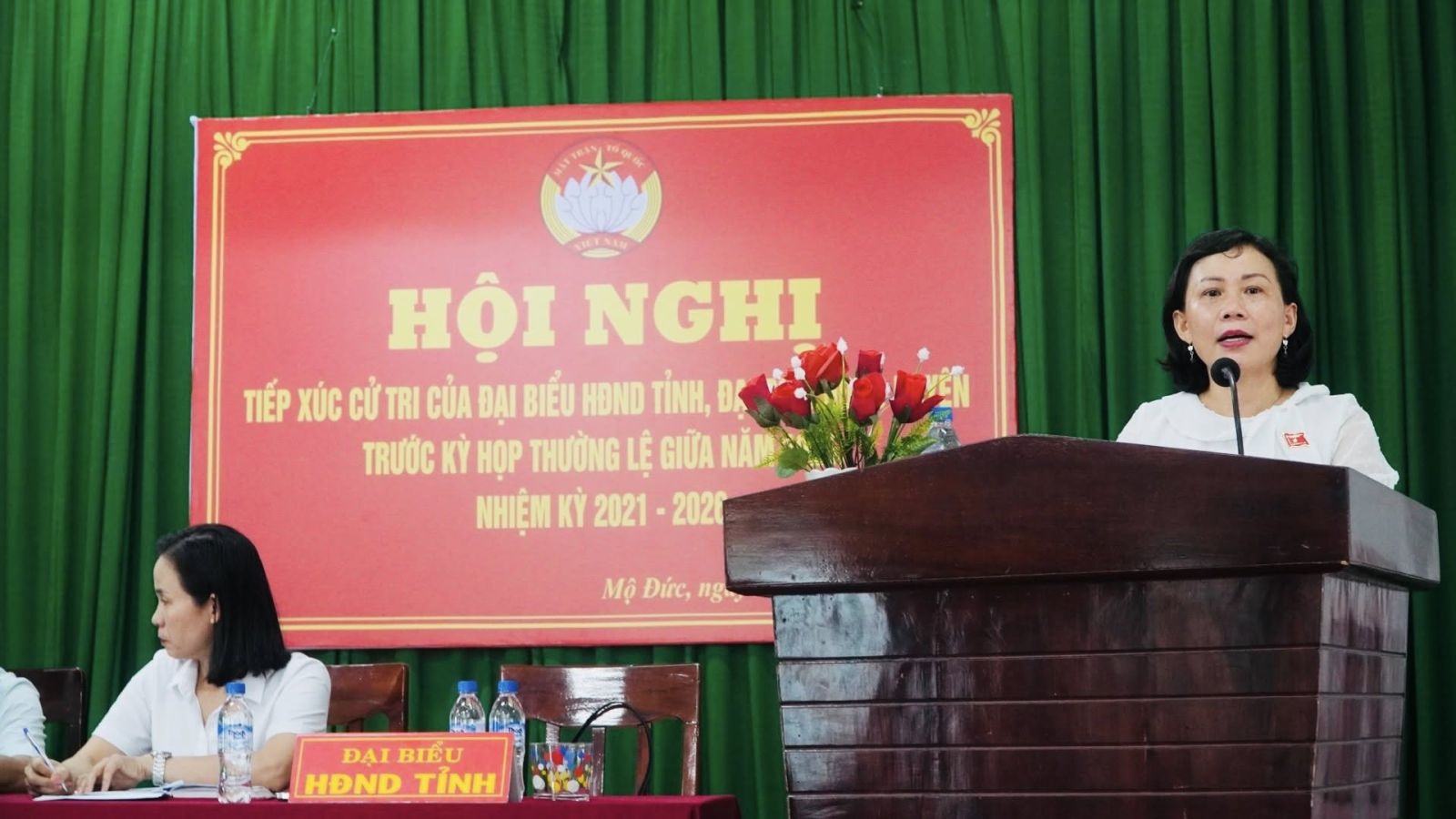 Tại buổi tiếp xúc, cử tri xã Đức Tân, Đức Hoà, Đức Phú và thị trấn Mộ Đức đã phản ánh, kiến nghị một số vấn đề liên quan đến việc đầu tư, hoàn thiện hệ thống nước sạch nhằm bảo đảm nhu cầu sinh hoạt thiết yếu cho người dân; Xử lý dứt điểm tình trạng ô nhiễm môi trường tại các khu dân cư; Việc chậm giải quyết thủ tục đất đai, dồn điền đổi thửa và cấp Giấy chứng nhận quyền sử dụng đất. Cử tri cũng phản ánh công tác thu hồi đất, đền bù còn chưa thỏa đáng, đề nghị cấp có thẩm quyền xem xét, điều chỉnh để đảm bảo quyền lợi chính đáng cho người dân.