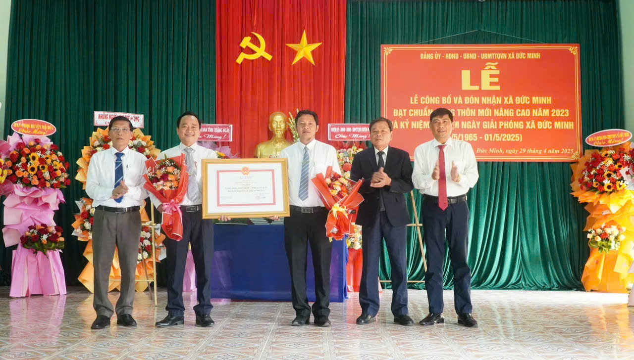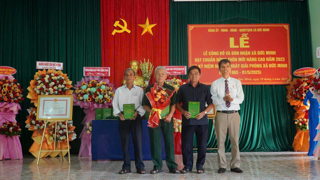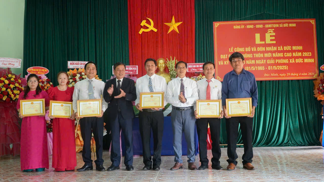 Tại buổi lễ, thừa ủy quyền của Chủ tịch UBND tỉnh, đại diện lãnh đạo Sở NN&MT tỉnh và lãnh đạo huyện Mộ Đức đã trao Bằng công nhận xã đạt chuẩn NTM nâng cao năm 2023 cho Đảng bộ, chính quyền và nhân dân xã Đức Minh.Ngoài ra, lãnh đạo huyện Mộ Đức đã trao Bằng khen của Chủ tịch UBND tỉnh cho xã Đức Minh có thành tích trong phong trào thi đua xây dựng NTM nâng cao năm 2023.