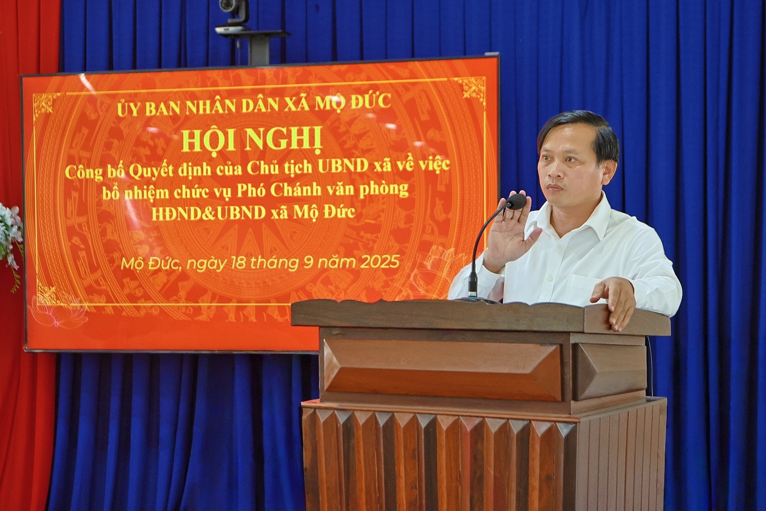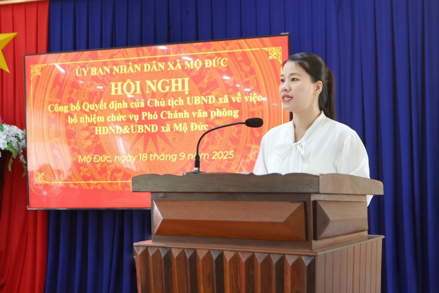 Sáng ngày 18/9/2025, UBND xã Mộ Đức tổ chức Lễ công bố Quyết định bổ nhiệm Phó Chánh Văn phòng HĐND & UBND xã. Dự lễ công bố có bà Phạm Thị Lệ Nguyên – Bí thư Đảng ủy, Chủ tịch HĐND xã; đồng chí Nguyễn Xuân Thái – UVBTV, Chủ tịch UBND xã Mộ Đức;đồng chí Phạm Ngọc Tư – UVBTV, Phó Chủ tịch UBND xã Mộ Đức;đồng chí Phạm Thị Ngọc Diễm – UVBTV, Phó Chủ tịch UBND xã Mộ Đức;