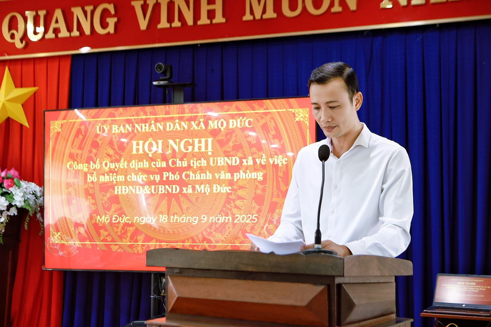 Tại buổi lễ, ông Võ Hoài Linh – Trưởng phòng Văn hóa – Xã hội xã Mộ Đức đã đọc công bố Quyết định số 1720/QĐ-UBND ngày 15/9/2025 của Chủ tịch UBND xã về việc bổ nhiệm bà Phạm Như Mây giữ chức vụ Phó Chánh Văn phòng HĐND & UBND xã Mộ Đức.