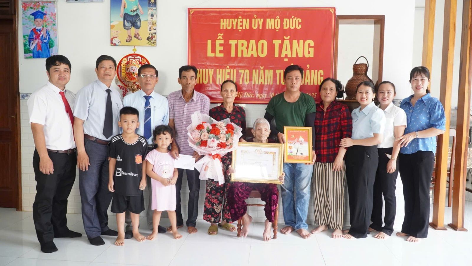 Sáng ngày 30/5/2025, Huyện ủy Mộ Đức tổ chức lễ trao tặng Huy hiệu 70 năm tuổi Đảng cho cụ bà Ngô Thị Vê là đảng viên thuộc chi bộ thôn Lâm Thượng xã Đức Phong. Dự buổi lễ có đồng chí Nguyễn Quang Vinh - Phó Bí thư Huyện ủy, Chủ tịch HĐND huyện; cùng các đồng chí Ủy viên Ban thường vụ Huyện ủy; tham dự lễ còn có các đồng chí Phó Bí thư Đảng ủy xã Đức Phong, Bí thư chi bộ thôn Lâm Thượng.