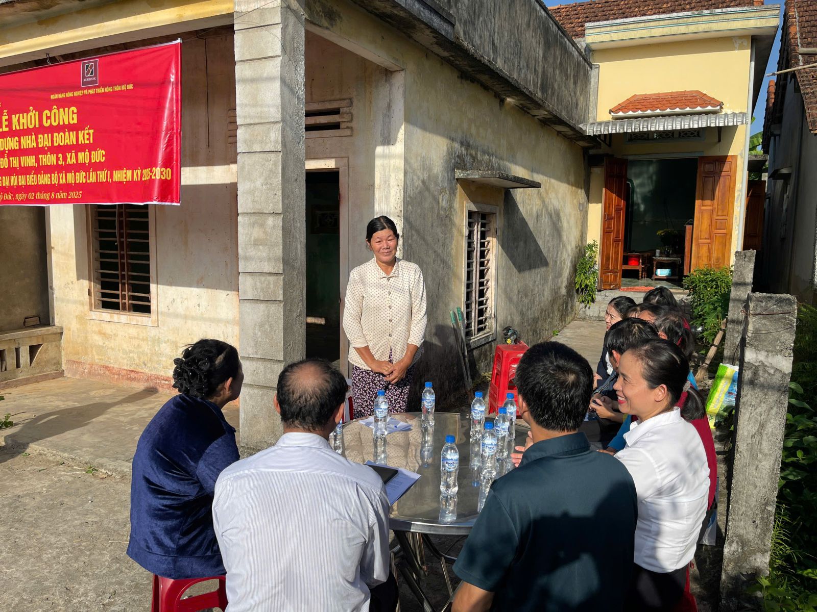 Hộ bà Đỗ Thị Vinh, thuộc diện hộ cận nghèo, có hoàn cảnh khó khăn, có người con trai lao động chính của gia đình bị tai nạn lao động, nằm một chỗ, không tự phục vụ được. Hiện hai mẹ con bà sống trong ngôi nhà không đảm bảo an toàn khi mùa mưa bão đến, không có điều kiện sửa chữa, làm lại nhà. Biết được hoàn cảnh khó khăn của gia đình, UBMTTQ Việt Nam xã đã kêu gọi, phối hợp với Ngân hàng Nông nghiệp và phát triển nông thôn chi nhánh Mộ Đức hỗ trợ làm lại ngôi nhà cho gia đình bà Đỗ Thị Vinh. Tổng kinh phí hỗ trợ xây dựng ngôi nhà là 50 triệu đồng. Ngôi nhà dự kiến sẽ hoàn thành trong tháng 8-2025.