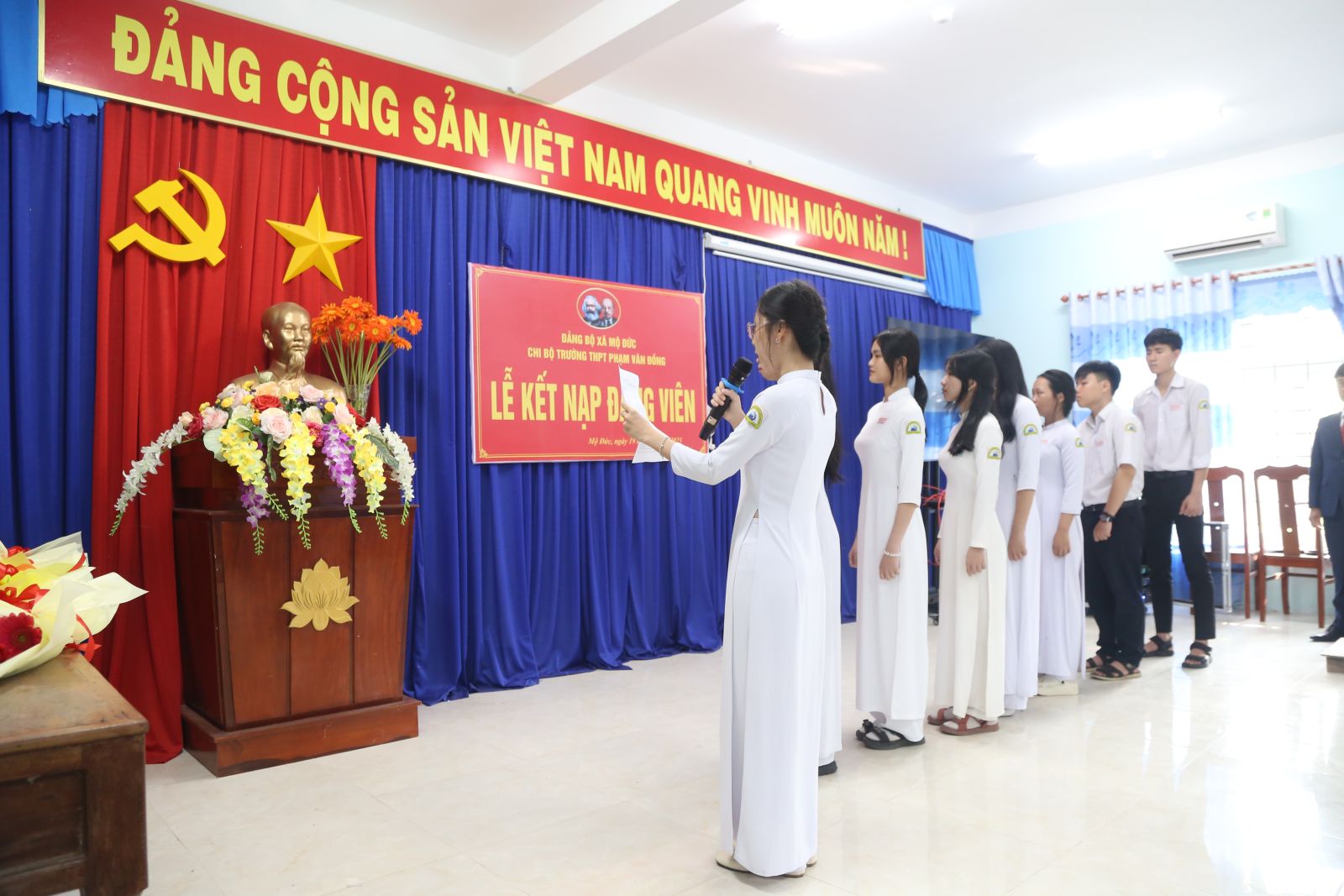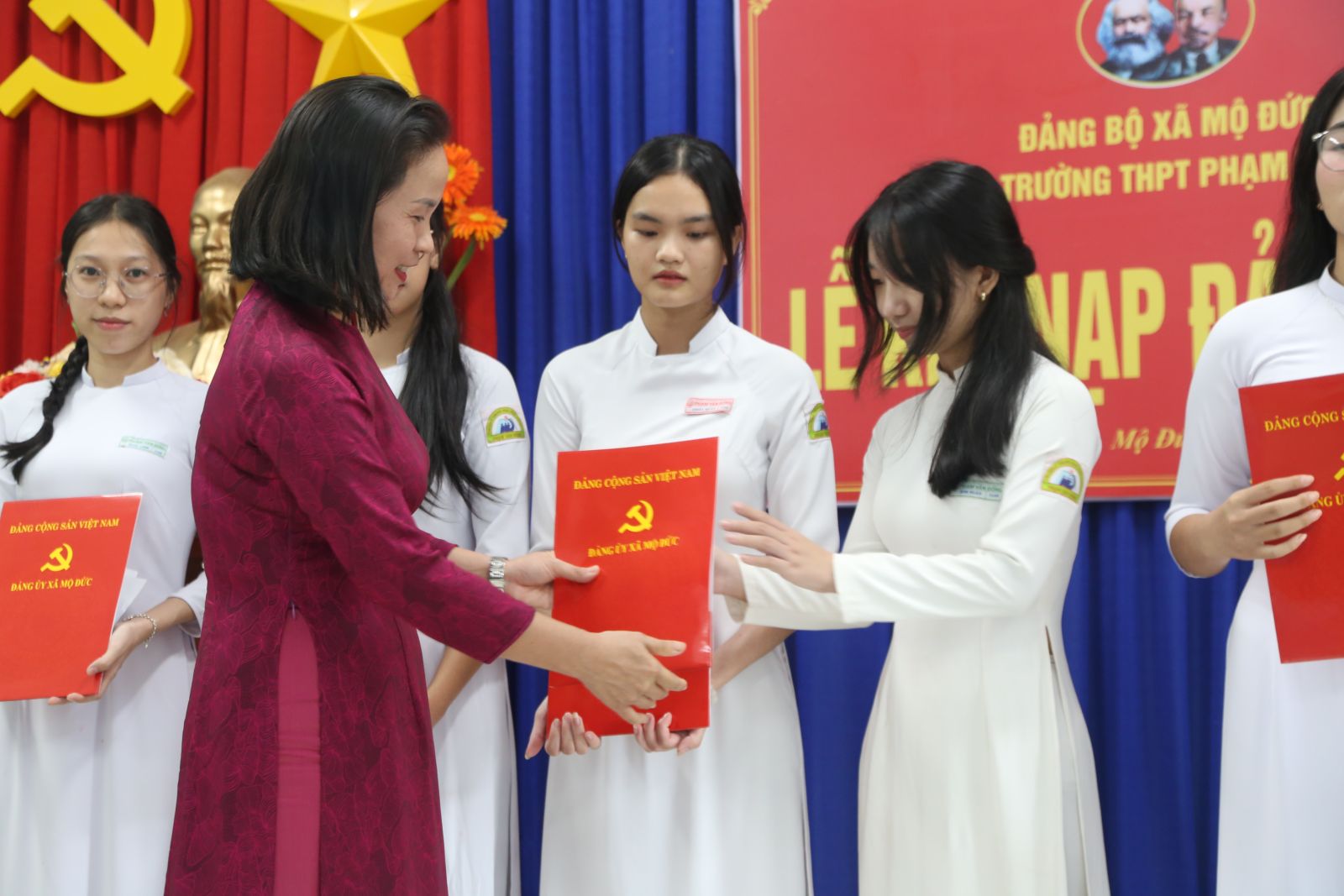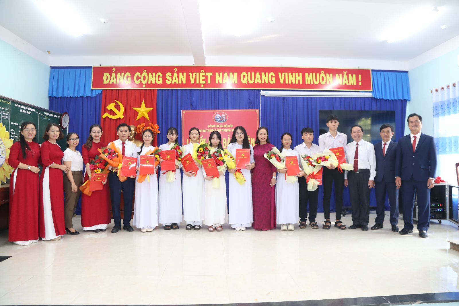 Tại buổi lễ, thay mặt Thường trực Đảng uỷ xã Mộ Đức, Chi bộ nhà trường đã trao quyết định kết nạp vào Đảng Cộng sản Việt Nam cho 10 giáo viên, nhân viên và học sinh ưu tú của nhà trường, gồm 02 giáo viên, nhân viên Bùi Phan Thiên Thưởng; Nguyễn Thị Thanh Lam; và 08 em học sinh: Huỳnh Dĩnh Khang; Phạm Triệu Chiêu Quân; Nguyễn Thuỳ Linh; Bùi Lâm Ngọc Linh; Phạm Thanh Kiệt; Phạm Thị Ái; Trần Thị Kim Ngân; Bùi Thị Phương Lan. Đây là những giáo viên, nhân viên, học sinh ưu tú, xuất sắc trong học tập và các hoạt động phong trào của nhà trường.