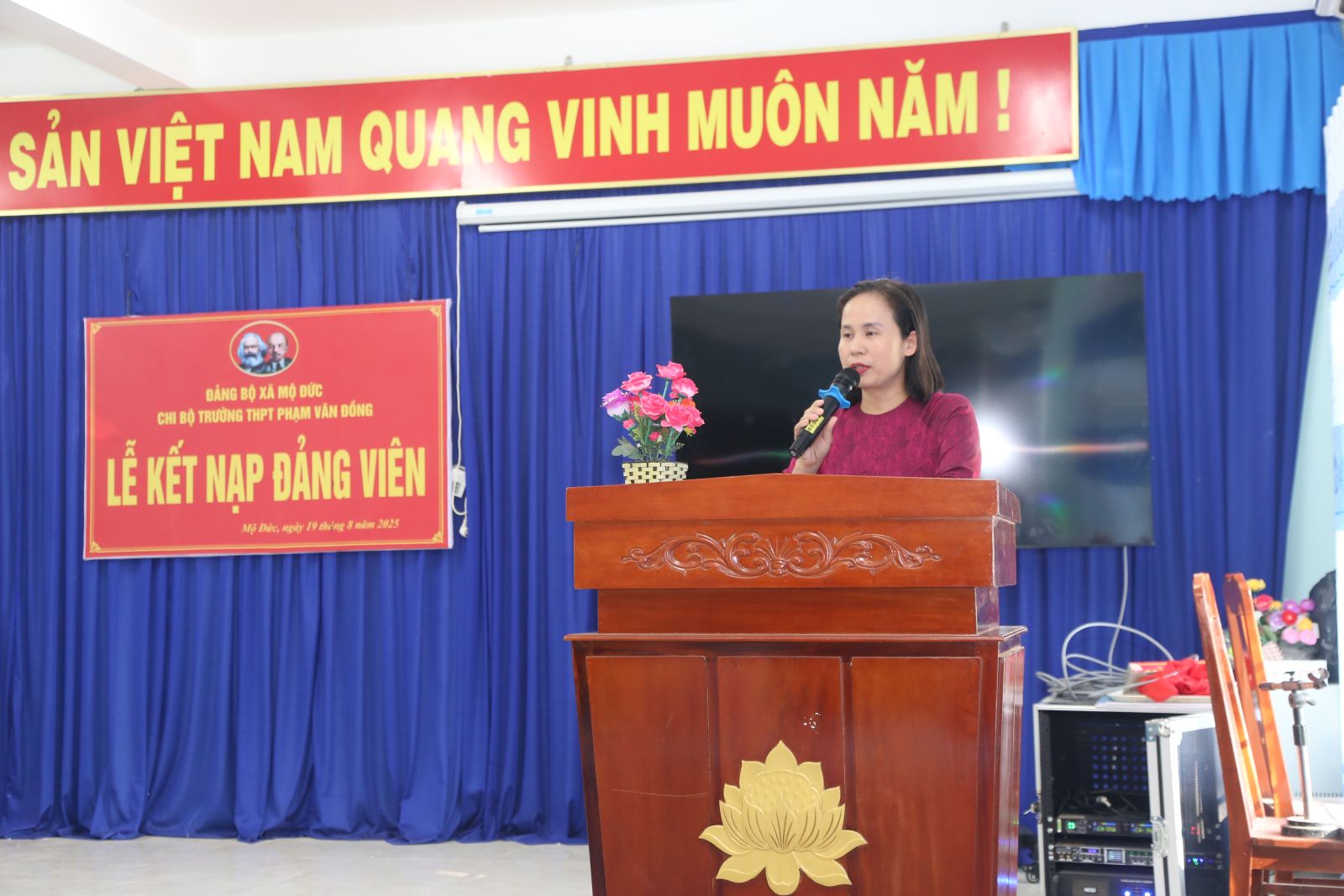 Phát biểu tại buổi lễ, đồng chí Phạm Thị Lệ Nguyên – Bí thư Đảng ủy, Chủ tịch HĐND xã, đã thay mặt Ban thường vụ xã nhà chúc mừng các đồng chí đảng viên mới vừa chính thức đứng vào hàng ngũ của Đảng. Đồng chí xác định đây cũng là một vinh dự, đồng thời cũng là trách nhiệm nặng nề, do đó các đồng chí Đảng viên mới cần tiếp tục rèn luyện,nỗ lực phấn đấu nhiều hơn nữa, phát huy những phẩm chất tốt đẹp của người đảng viên Đảng cộng sản. Đồng chí Bí thư Đảng ủy cũng ghi nhận và biểu dương Chi bộ Trường THPT Phạm Văn Đồng trong công tác phát triển đảng viên mới. Đồng chí Bí thư Đảng ủy đề nghị Chi bộ nhà trường tiếp tục phát huy những kết quả đạt được, thực hiện tốt hơn nữa nhiệm vụ chính trị của Chi bộ để cùng với Đảng bộ hoàn thành tốt các nhiệm vụ được cấp trên giao./.
