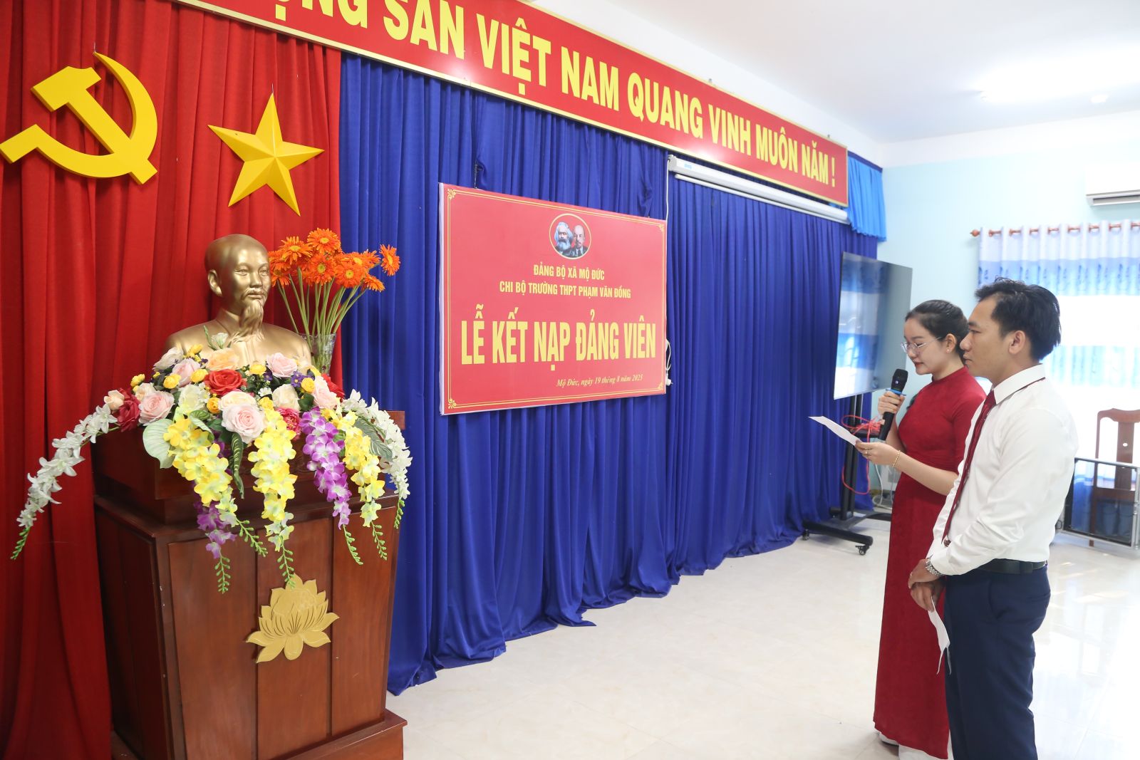 Thực hiện chỉ đạo về công tác xây dựng Đảng và phát triển Đảng viên, đặc biệt phát triển đảng viên là học sinh. Trong năm 2025, Chi bộ trường THPT Phạm Văn Đồng đã tích cực quan tâm, bồi dưỡng, giúp đỡ các quần chúng là học sinh ưu tú nâng cao nhận thức về Đảng. Trải qua một quá trình rèn luyện, tu dưỡng, phấn đấu và trưởng thành, nhiều em học sinh của nhà trường đã tự khẳng định mình và mong muốn đứng vào hàng ngũ của đảng. Chi bộ nhà trường đã kết nạp 24 đảng viên đứng vào hàng ngũ của Đảng. Đạt và vượt 200%, chỉ tiêu phát triển Đảng viên của Chi bộ nhà trường. Góp phần cùng Đảng bộ xã Mộ Đức sớm hoàn thành chỉ tiêu phát triển đảng viên trong năm 2025.