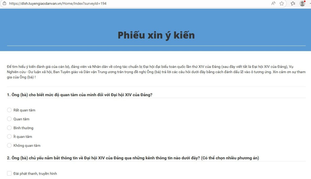 Để tìm hiểu ý kiến đánh giá của cán bộ, đảng viên và Nhân dân về công tác chuẩn bị Đại hội đại biểu toàn quốc lần thứ XIV của Đảng, Vụ Nghiên cứu - Dư luận xã hội, Ban Tuyên giáo và Dân vận Trung ương tổ chức điều tra dư luận xã hội về công tác chuẩn bị tổ chức Đại hội XIV của Đảng
